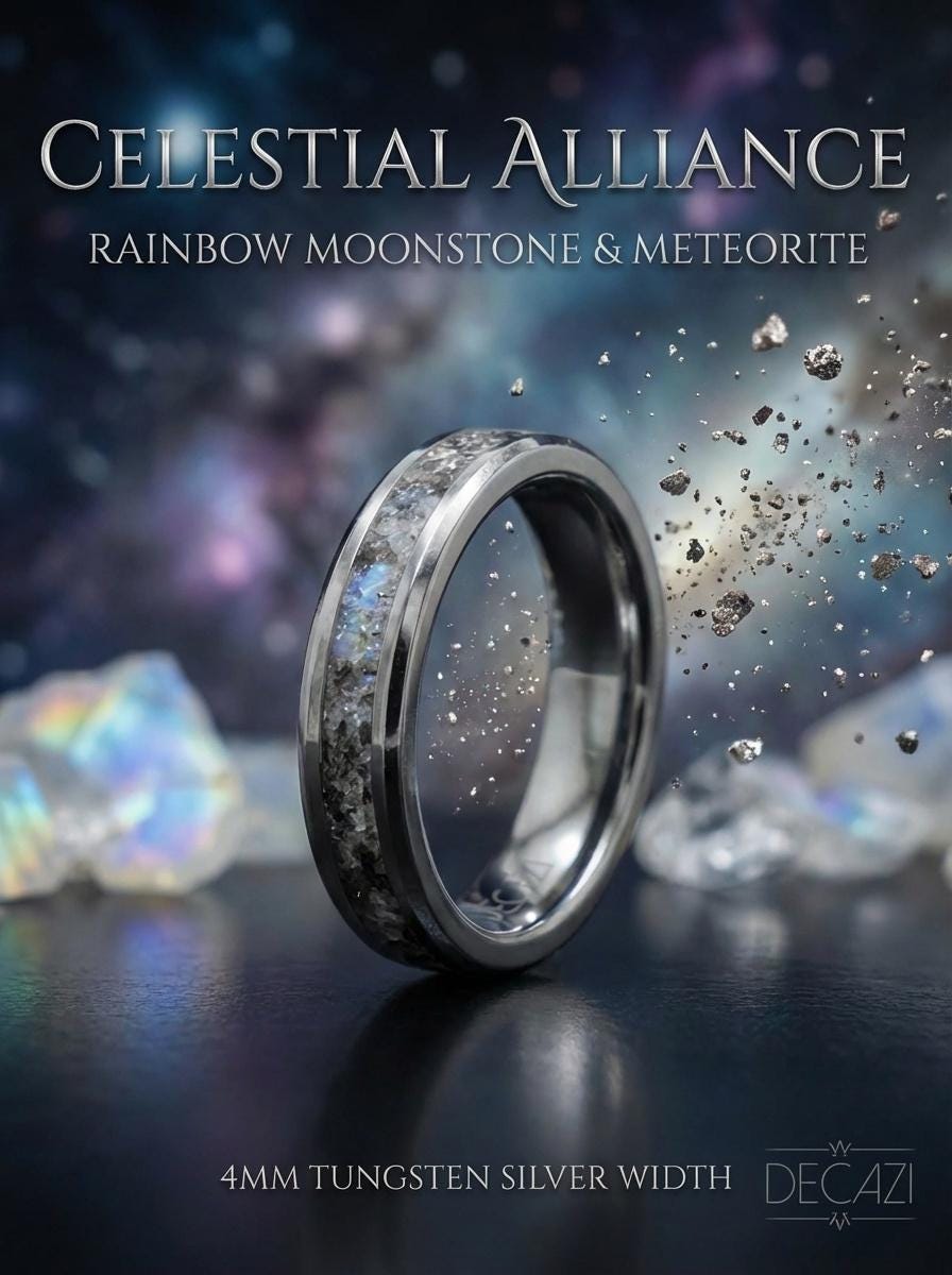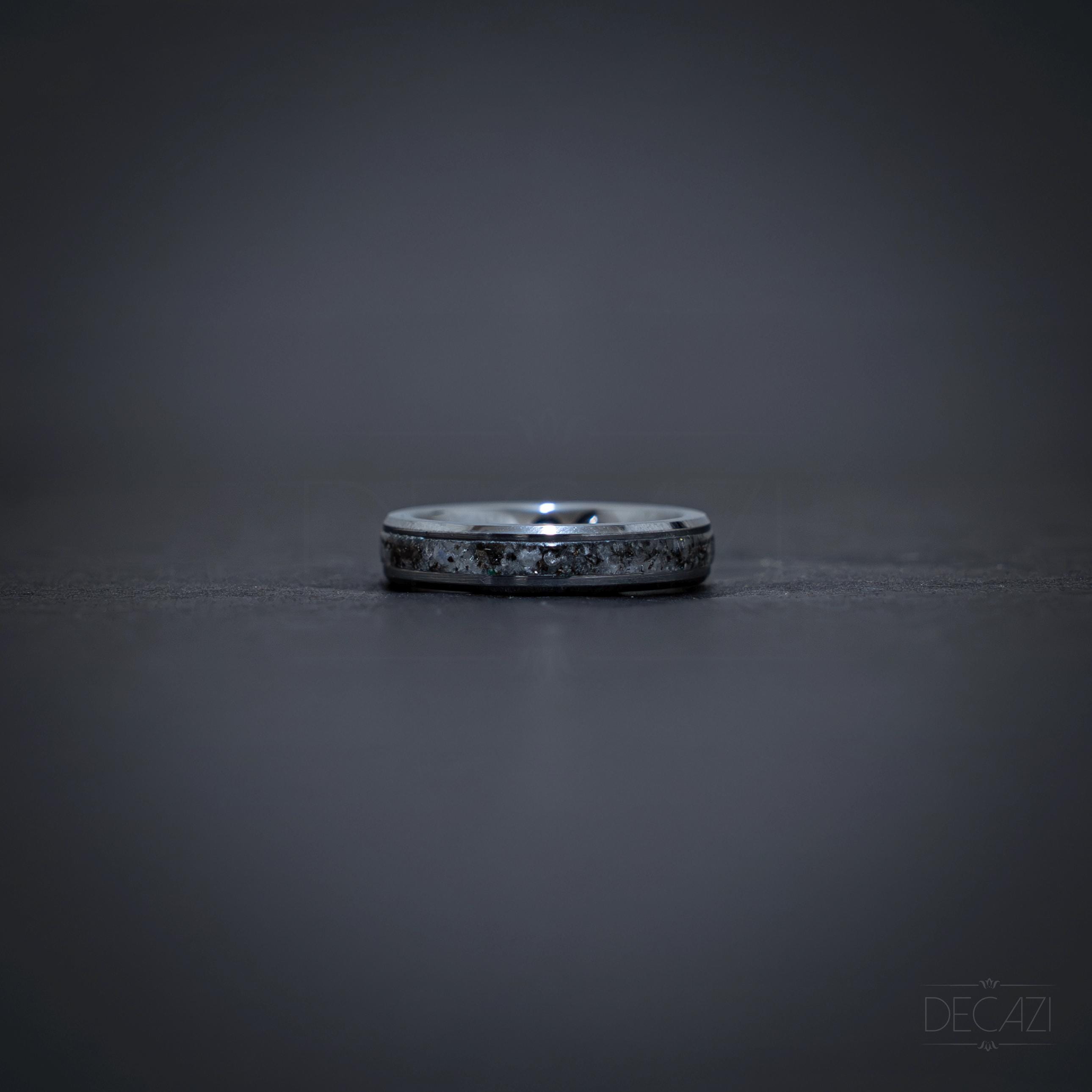 This 4 mm silver tungsten ring features a beautiful blend of rainbow moonstone and authentic Muonionalusta meteorite for a unique and elegant look. Its slim design and smooth comfort fit inside make it comfortable for everyday wear. A durable and meaningful choice for a wedding band, promise ring, or special gift.