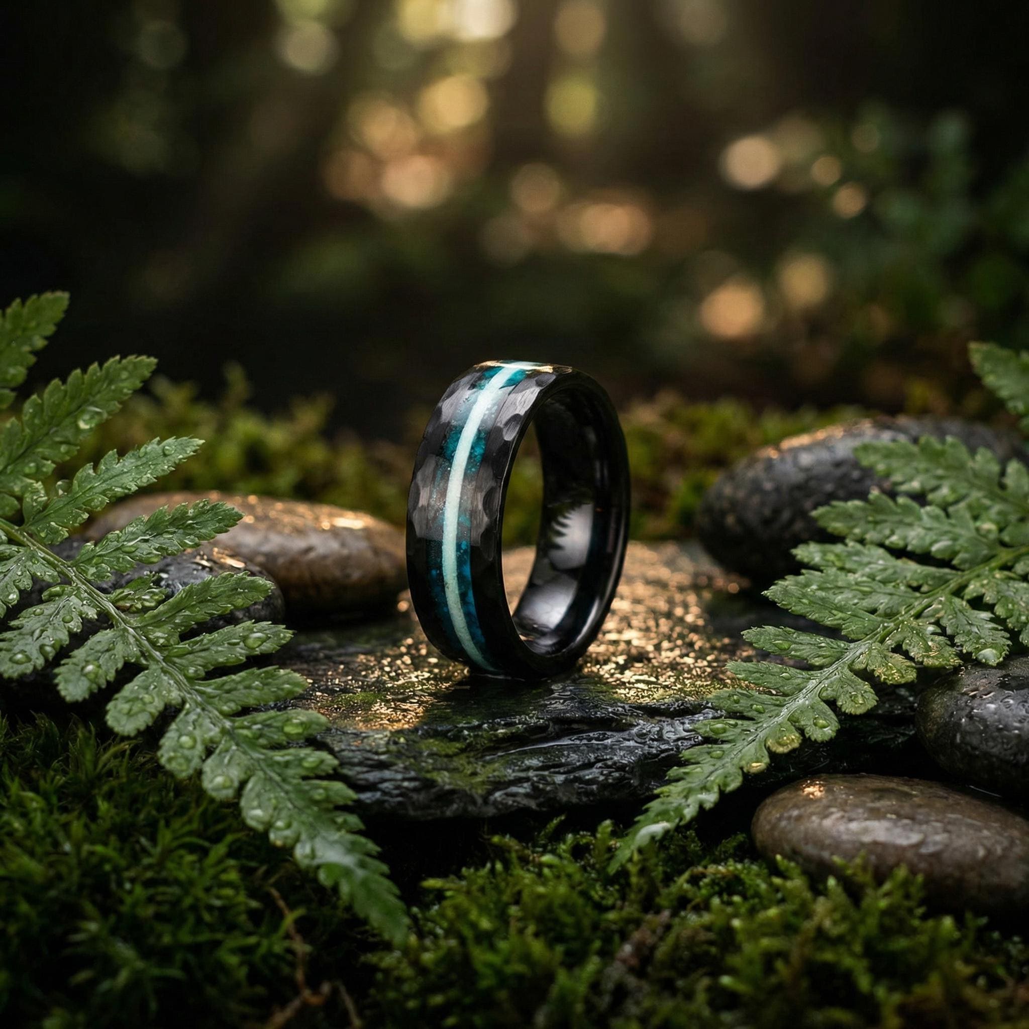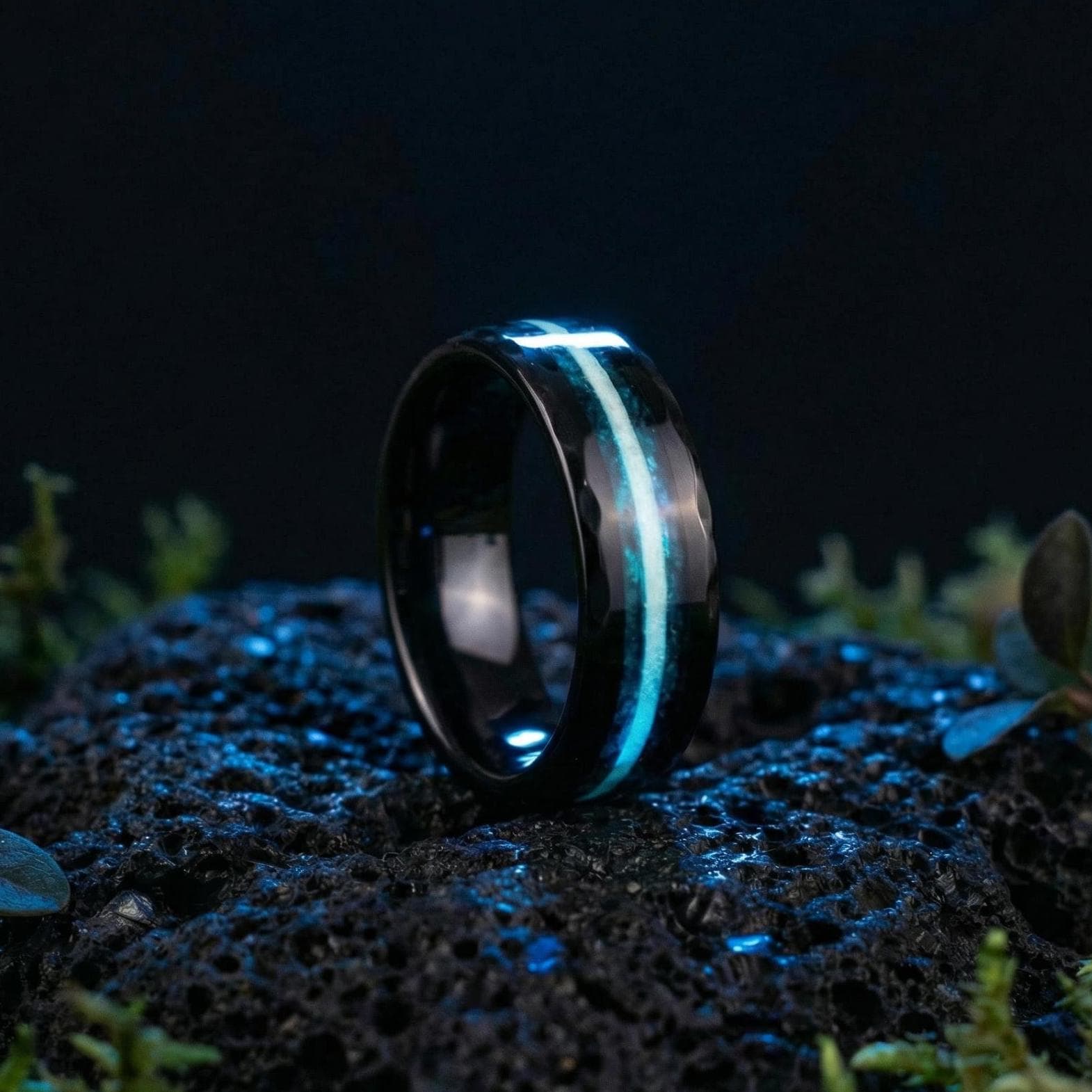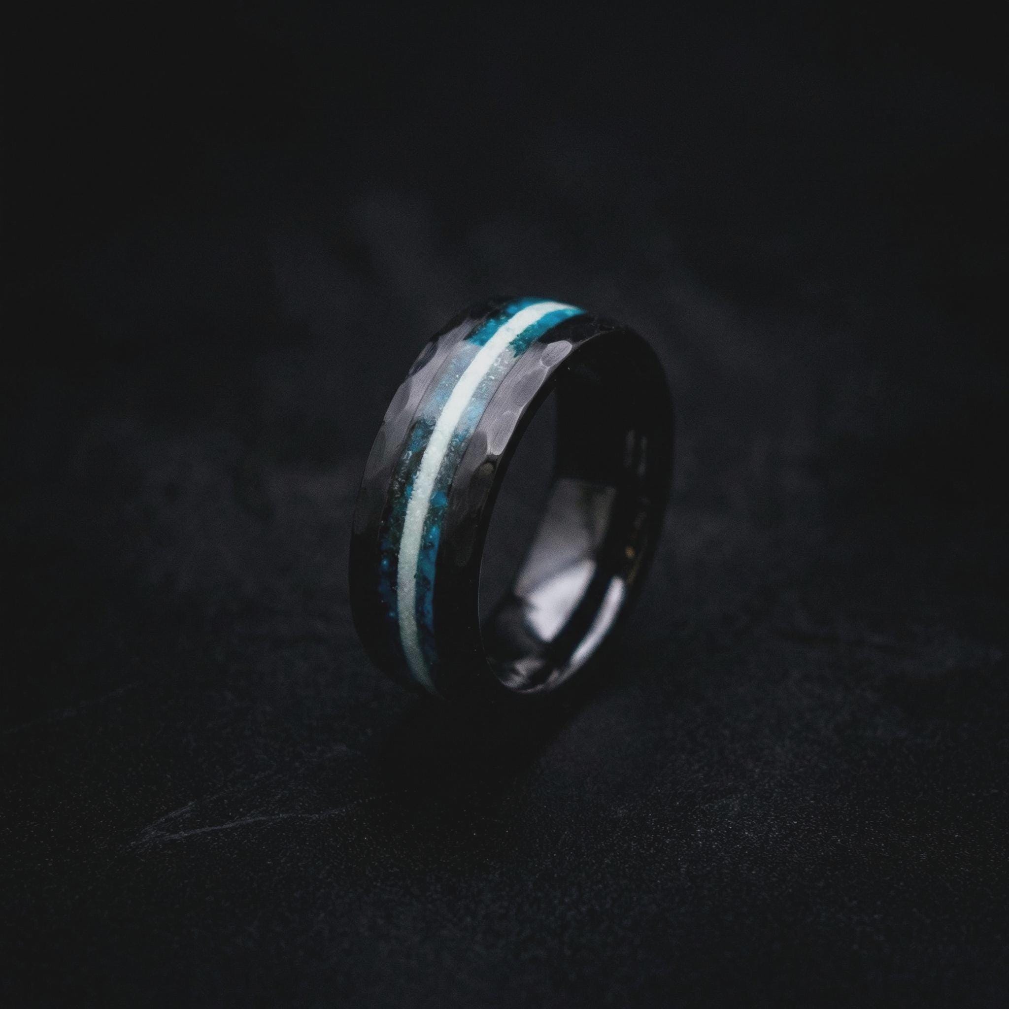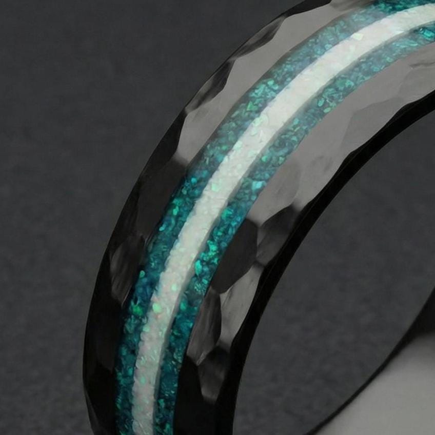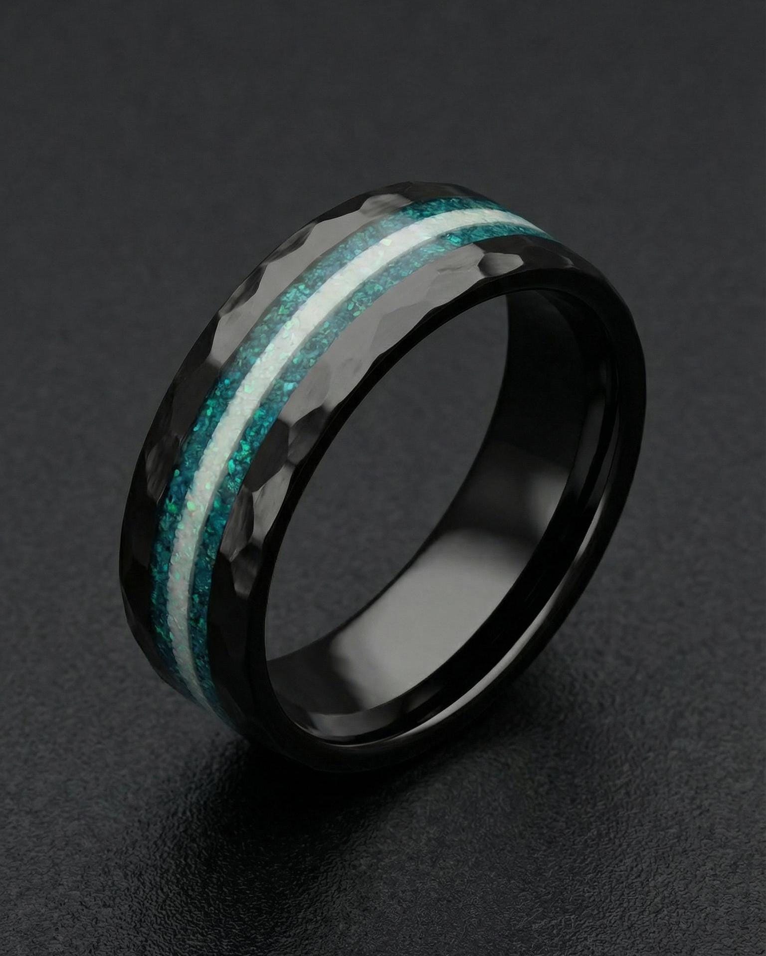 Glow in the Dark Galaxy Opal Ceramic Wedding Band for Men | Hammered Black Ring with Meteorite Inlay | Custom Sizes