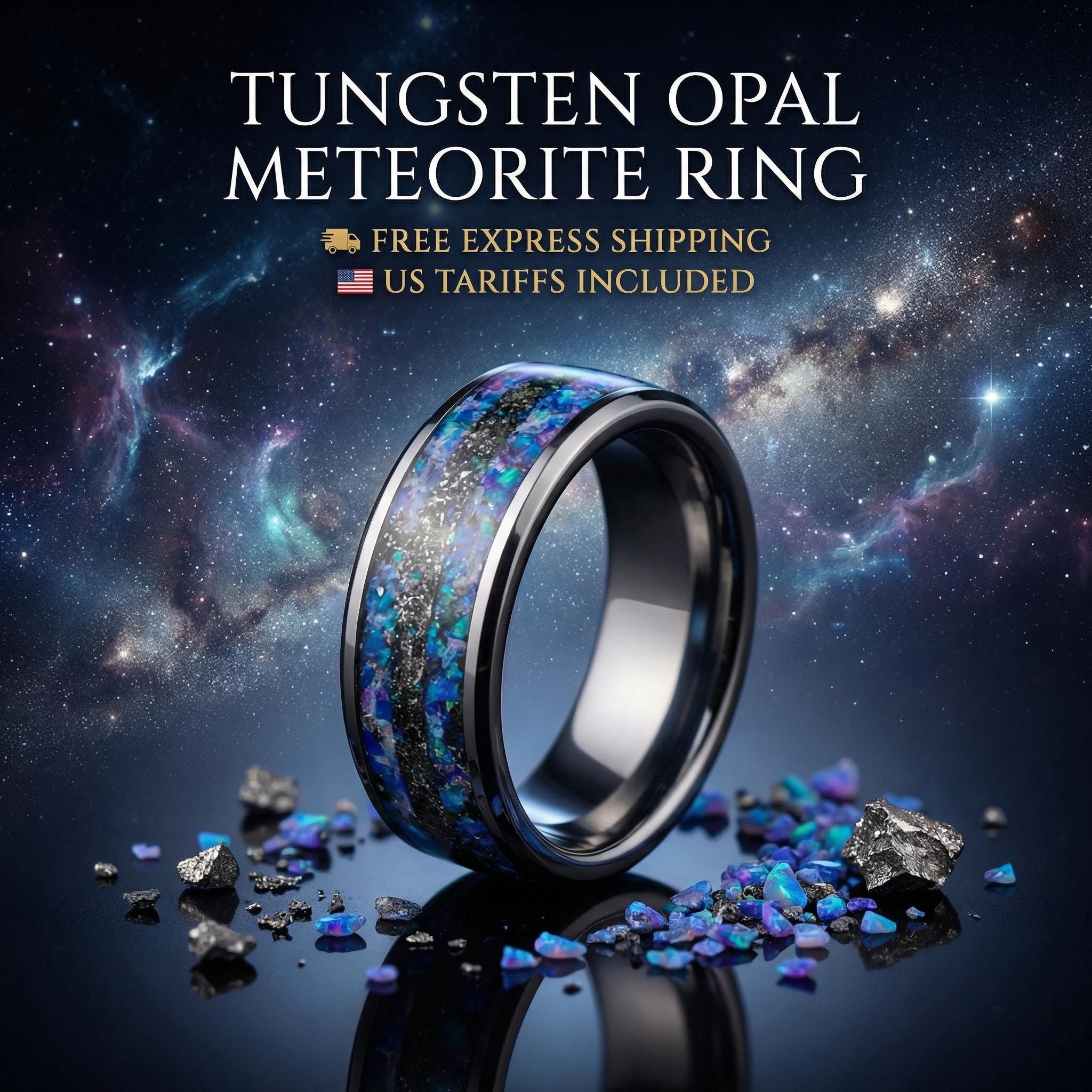 based on Our popular ring but in a different design. We call it flat design same width but more inlay and smaller edges, this way you get maximum details. In the center of this mens meteorite ring you will see genuine meteorite from the muonionalusta. On the sides you will see a galaxy with opals. The idea is that the meteorite forms a belt around the galaxy so you have a full spectrum of a miniature galaxy.