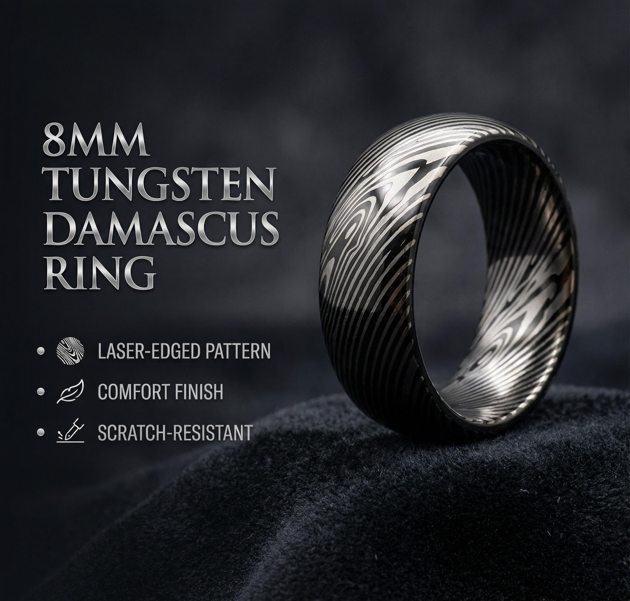 This ring is specially designed by us for those who are allergic for metal but still want to wear a ring with a Damascus pattern. This ring is made out of tungsten and tungsten is well known for its hardness and its scratch resistance.