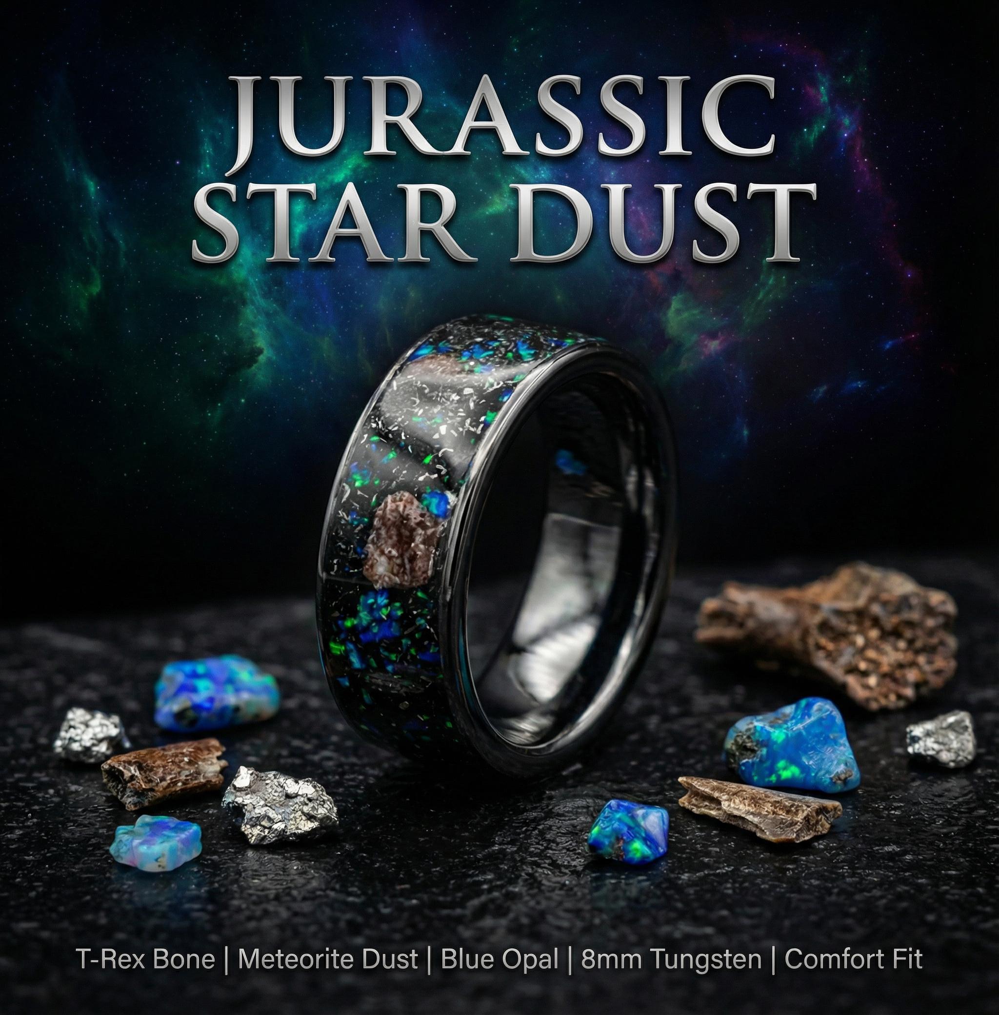 This ring is a different version of the triceratops ring, wider and more inlay content. We have used triceratops and meteorite.
